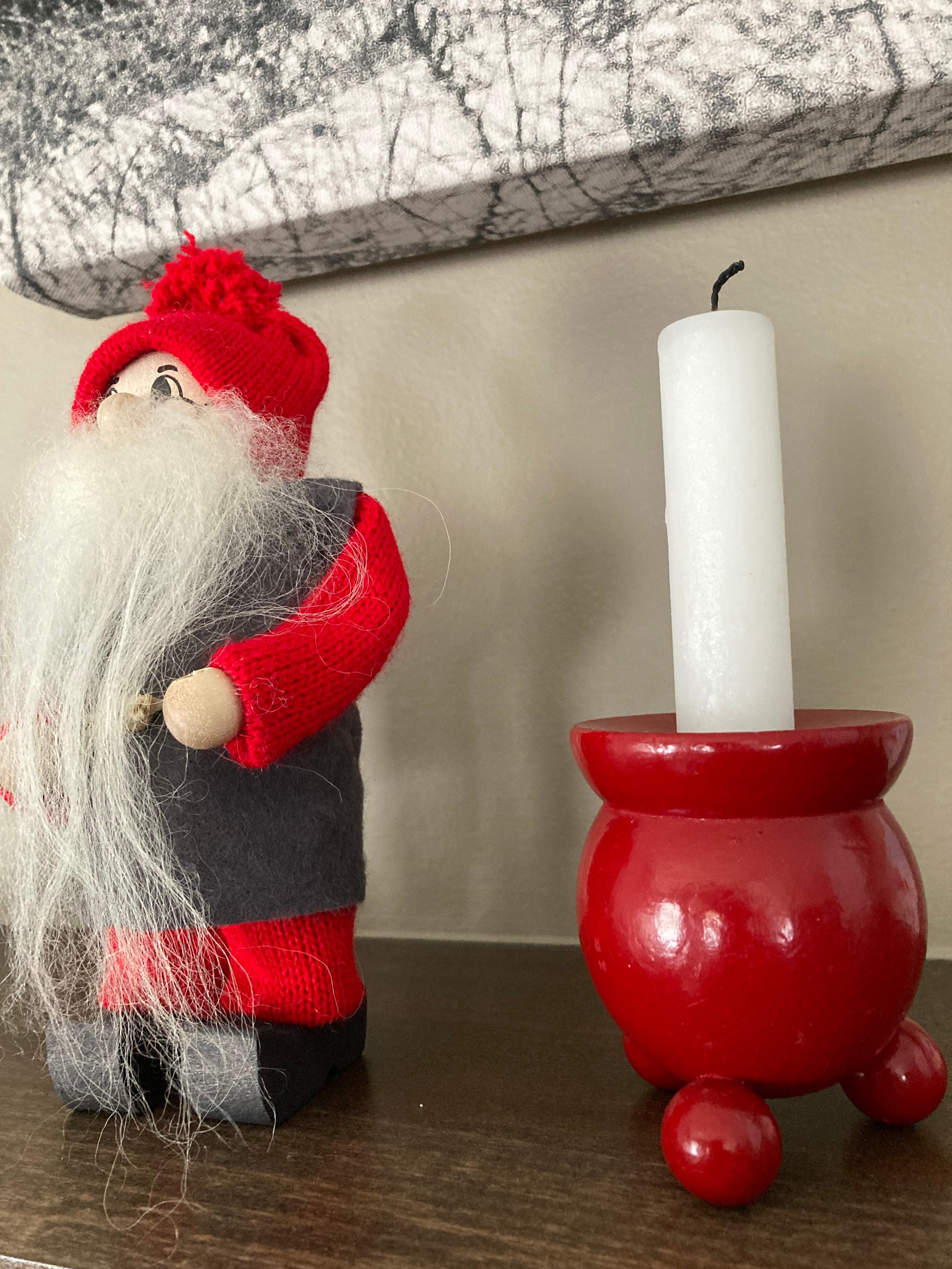 When I decorate in our small space, it only takes one or two of these rolling around in my hands before I put them on the mantel to open up years of warm memories of the Swedish side of my family gathered for Christmas traditions. A full turkey dinner on Christmas Eve at the Johnson farm, with rosettes and lingonberries for desert, all those presents under the tree and Grandma down in the floor with the children sharing their glee, midnight service brought to a close with my dad singing Sweet Little Jesus Boy (I knew he really was born as the last note drifted off into the sweet silence!), and the wooden candle holders painted red, and the little tomten guarding the farm, and the yulbock and….